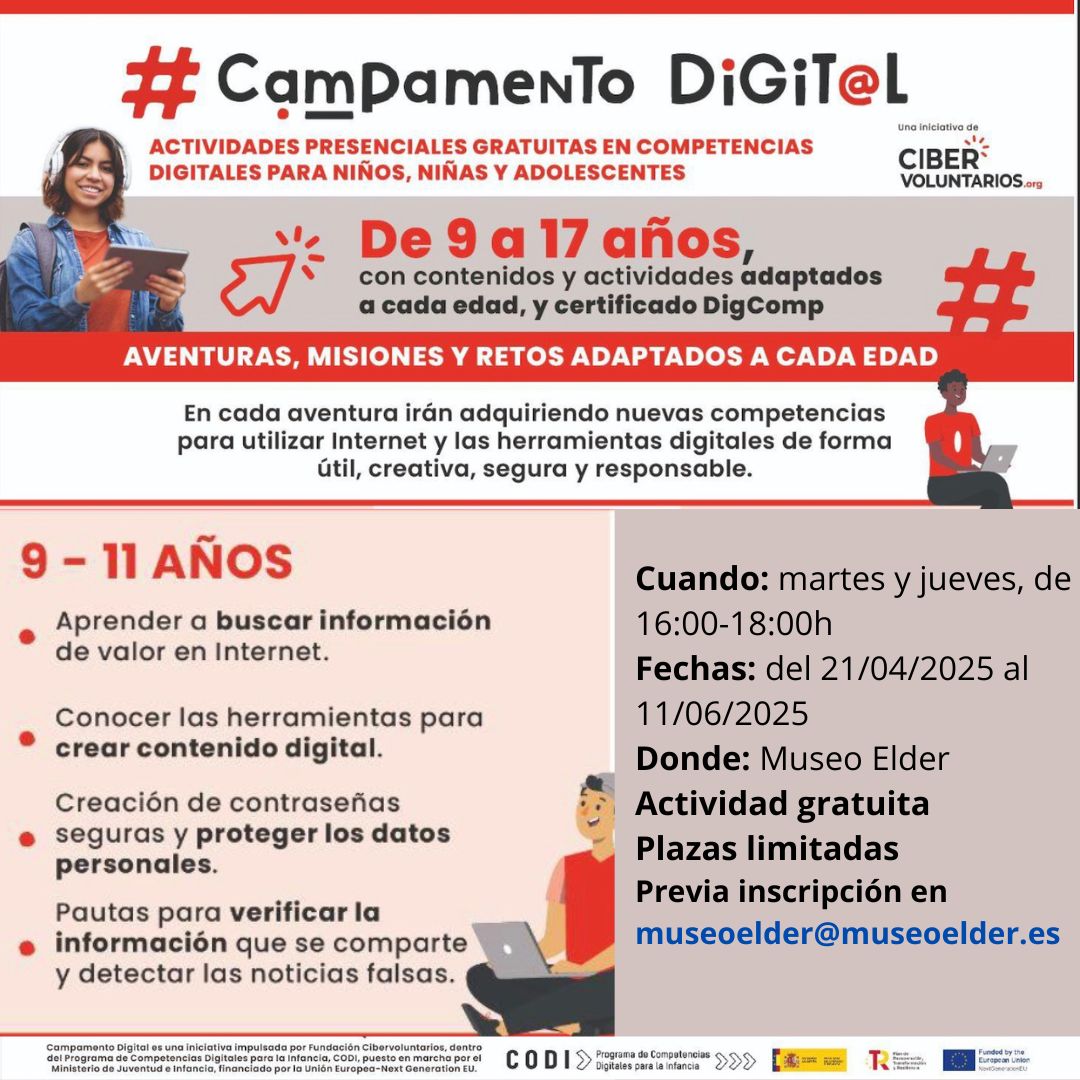 Campamento digital Del 21/04/2025 al 11/06/2025 Actividades presenciales gratuitas en competencias digitales para niños, niñas y adolescentes. El Museo Elder de la Ciencia y la Tecnología, acoge el Campamento […]