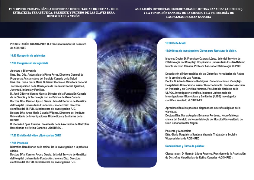 El primero de ellos girará en torno a la apertura y bienvenida institucional, contando con Antonia María Pérez Pérez, Directora General de Programas Asistenciales del Servicio Canario de la Salud, Dulce María Gutiérrez González, Directora General de Discapacidad de la Consejería de Bienestar Social, Igualdad, Juventud, Infancia y Familias, José Gilberto Moreno García. Director de la Fundación Canaria de la Ciencia y la Tecnología de Las Palmas de Gran Canaria, Carmen Ayuso García. Jefa del Servicio de Genética del Hospital Universitario Fundación Jiménez Díaz. Directora científica del IIS-FJD. Subdirectora de Investigación FJD, Anna María Claudia Wägner. Directora del Instituto Universitario de Investigaciones Biomédicas y Sanitarias de la ULPGC, y Germán López Fuentes, Presidente de la Asociación de Distrofias Hereditarias de Retina Canarias -ADISHREC- y miembro del Patronato de nuestra Fundación.