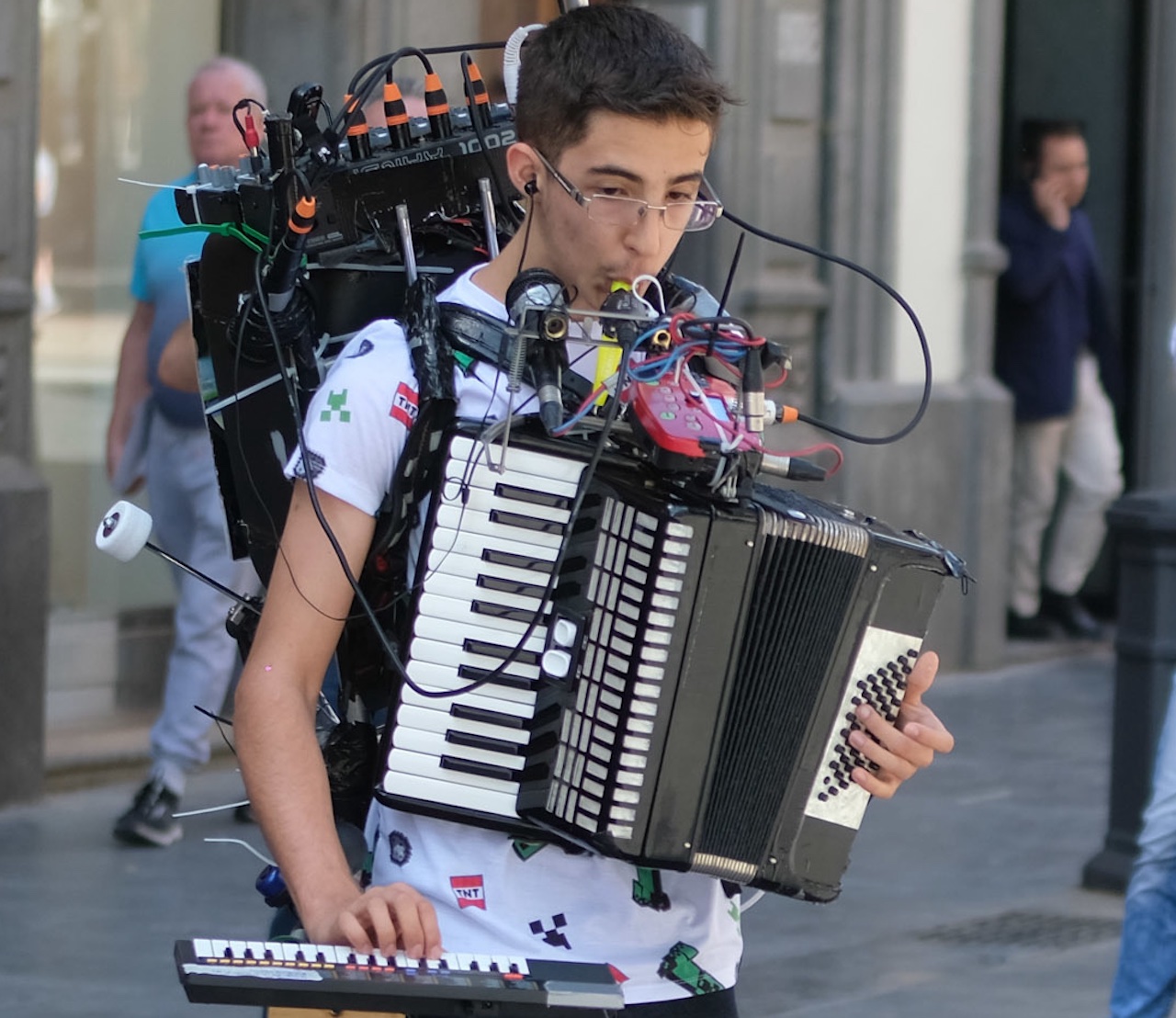Este joven hombre orquesta toca varios instrumentos musicales al mismo tiempo usando sus manos, pies y varios aparatos mecánicos.
